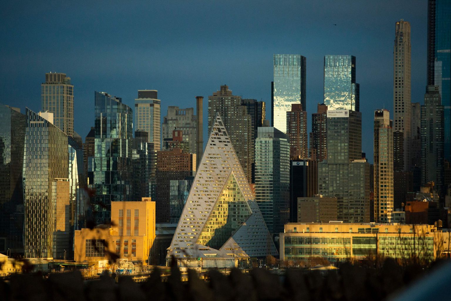 The New York City skyline is seen at sunset from Weehawken, New Jersey.