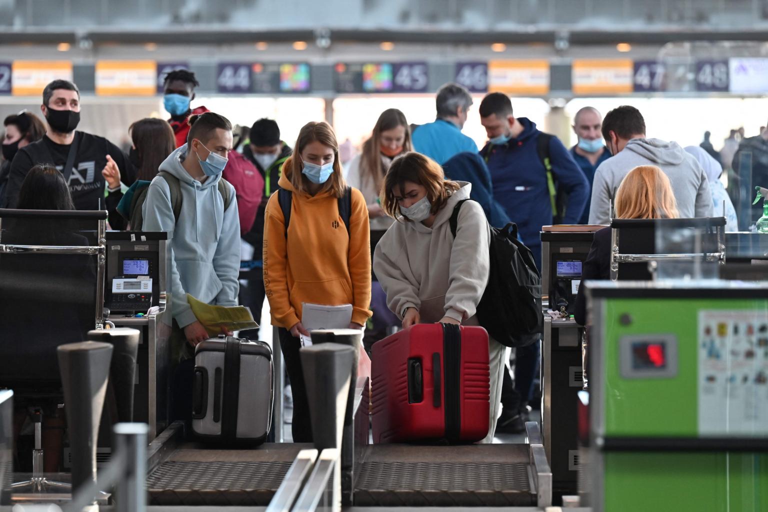 Travellers wait at the check-in counters ahead of their flights at the Boryspil airport some 30 kilometres outside Kyiv on Feb 13, 2022.