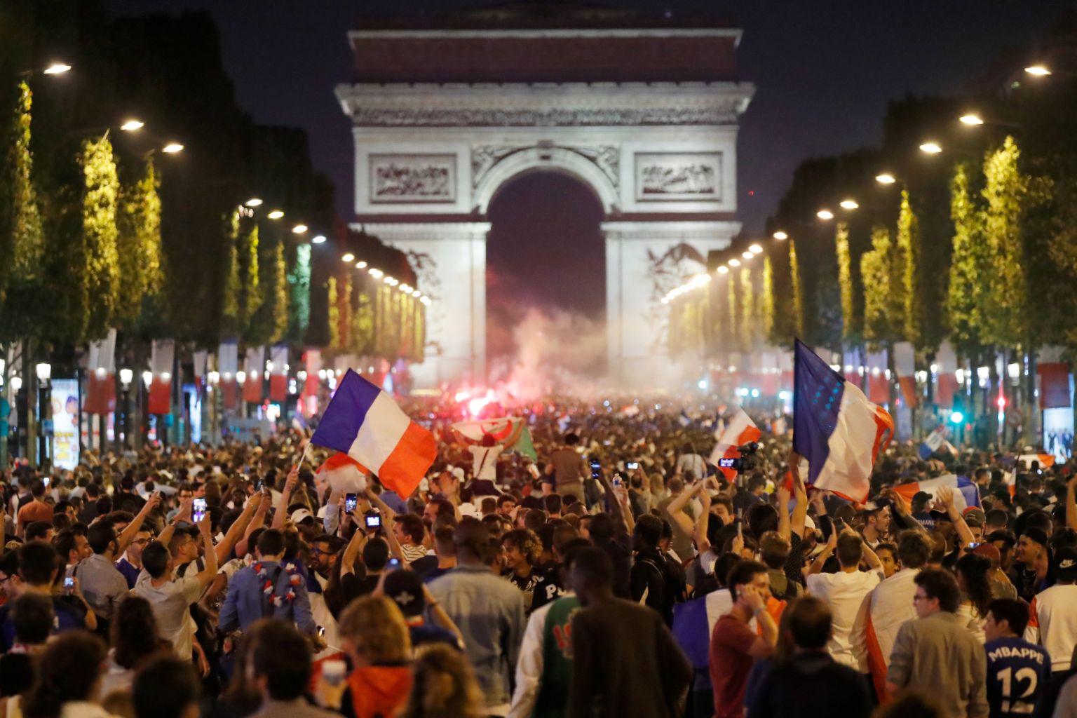 Football fans celebrating on the Champs-Elysees after France defeated Belgium in the semi-finals of the World Cup, on July 10, 2018.
