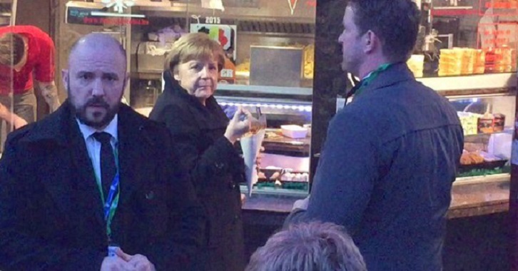 Britain's commercial ITV television showed footage of Merkel at the 'friterie' with her bodyguards.