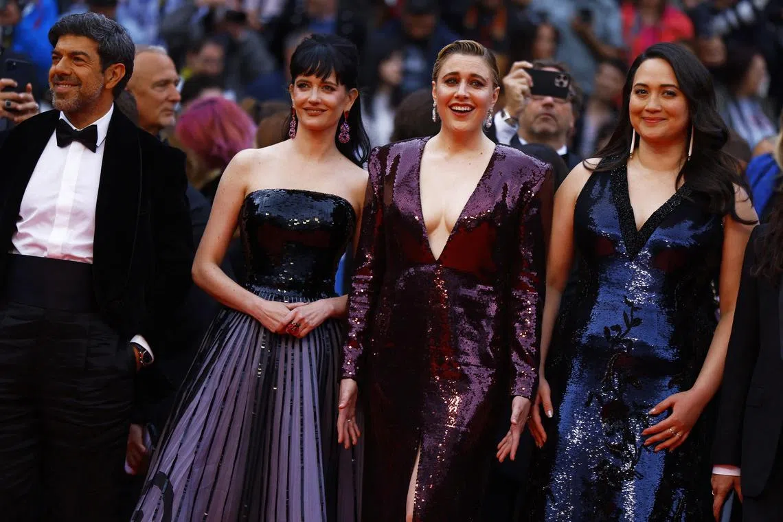 Greta Gerwig (second from right), jury president of the 77th Cannes Film Festival, and jury members (from left) Pierfrancesco Favino, Eva Green and Lily Gladstone on the festival’s red carpet on May 14.
