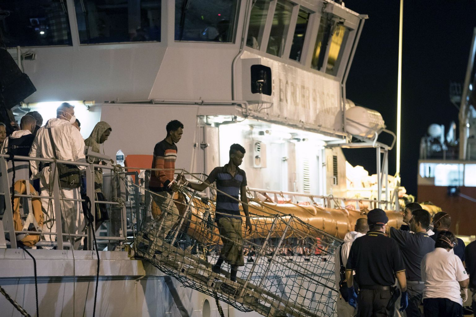 Migrants disembark from the Frontex ship "Protector" at the port of Pozzallo, Sicily, Italy, on July 16, 2018.