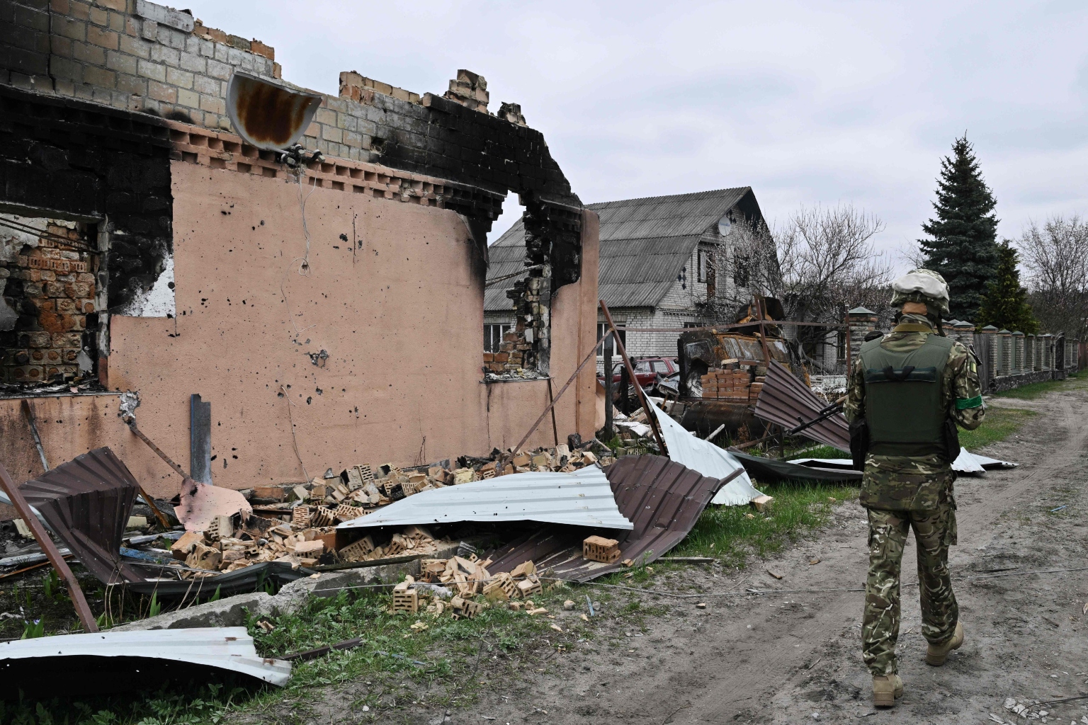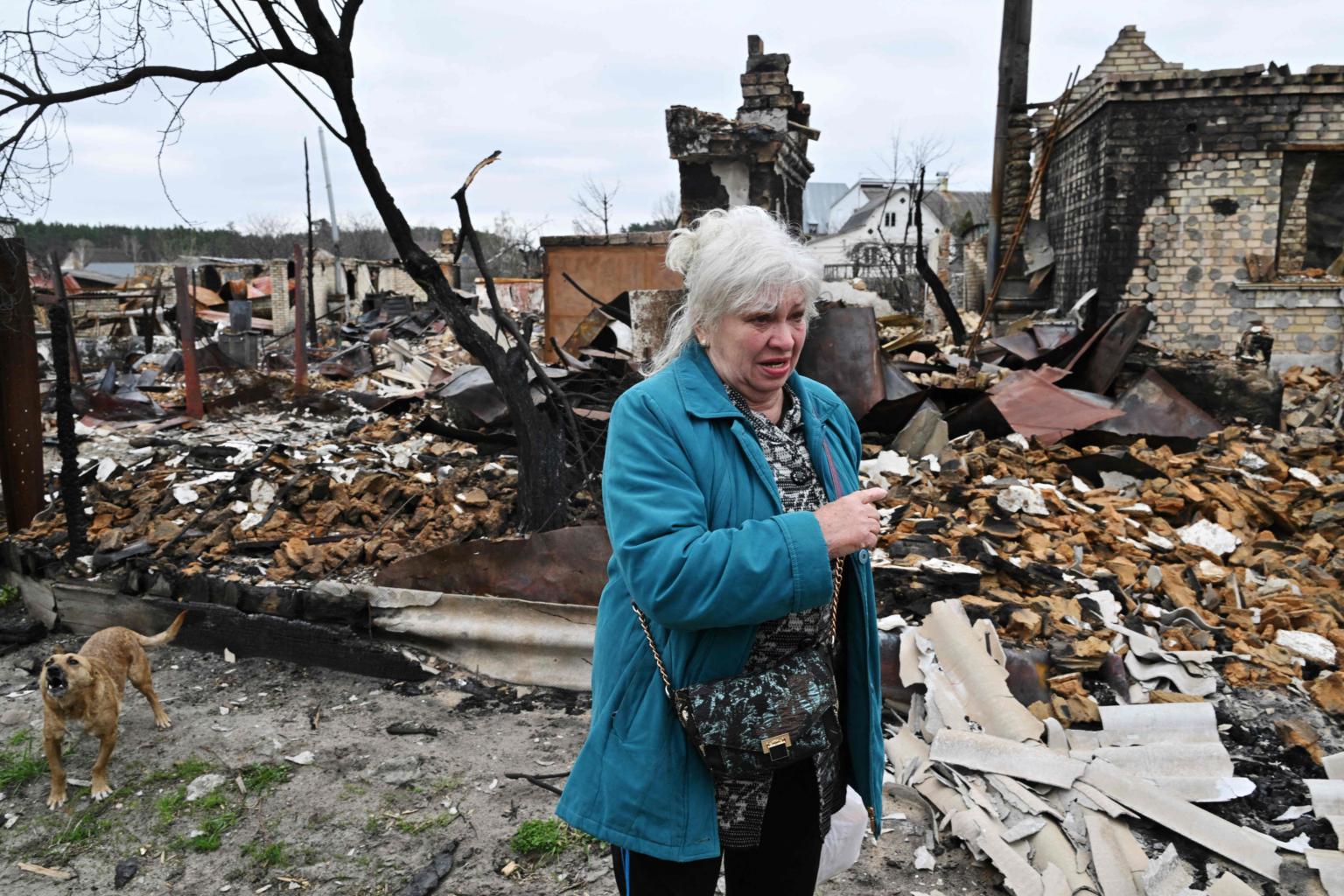 Ms Nadia Odientsova surveys the ruins of her home in Moshchun on April 20, 2022.