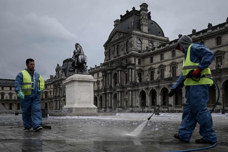 Workers clean the area in front of the Louvre Pyramid in Paris.