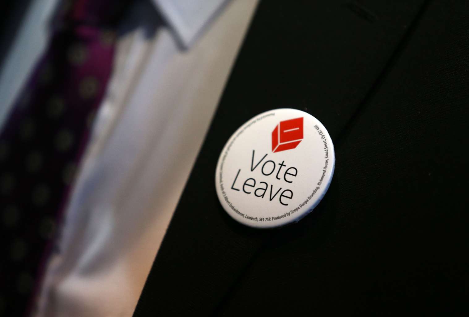 A "vote leave" badge is seen on the jacket of a man as he attends the world premiere of the film Brexit: the Movie in London's Leicester Square, ahead of the EU referendum in Britain.
