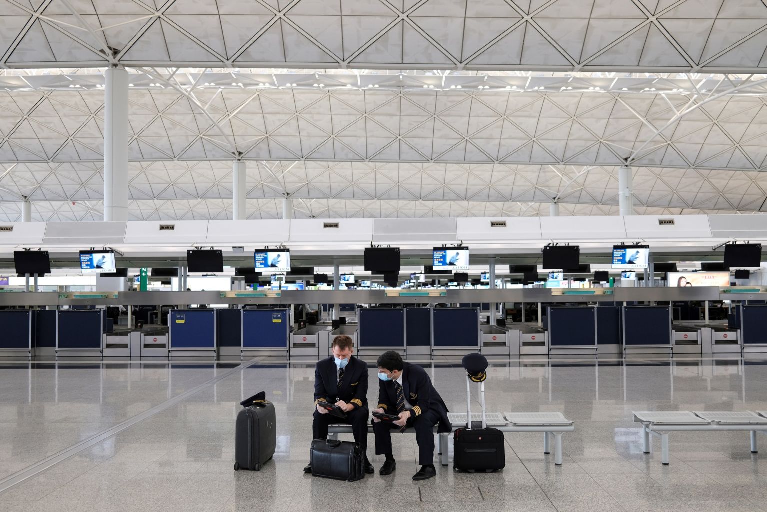 Pilots wearing face masks are seen at Hong Kong International Airport, in May 2020.