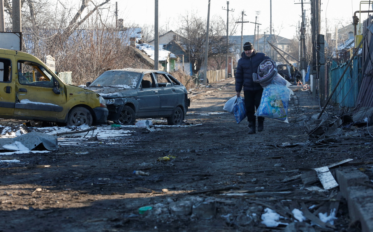 A local resident walking along a damaged street in the town of Volnovakha, Donetsk region, Ukraine, on March 12, 2022.
