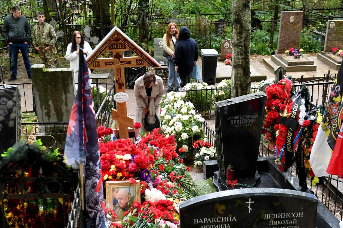 People visiting Mr Yevgeny Prigozhin’s grave at the Porokhovskoye cemetery in St Petersburg on Oct 1.