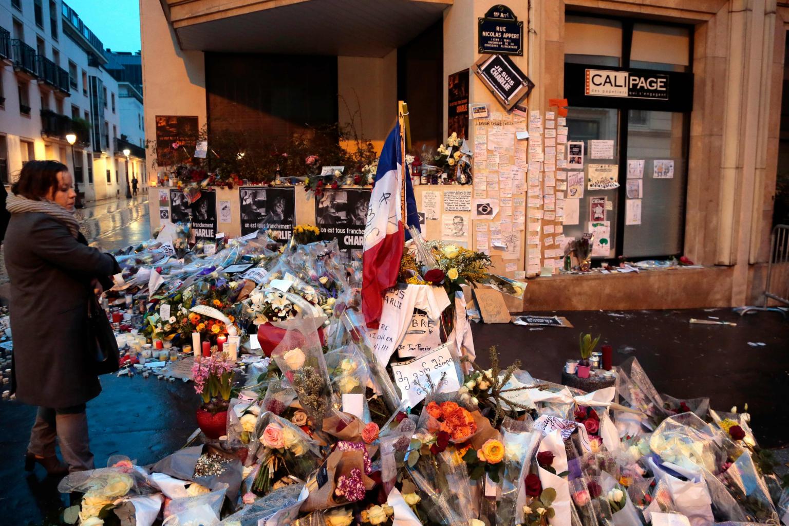 A woman looks at floral tributes left outside the Charlie Hebdo magazine offices in Paris, on Jan 9, 2015.