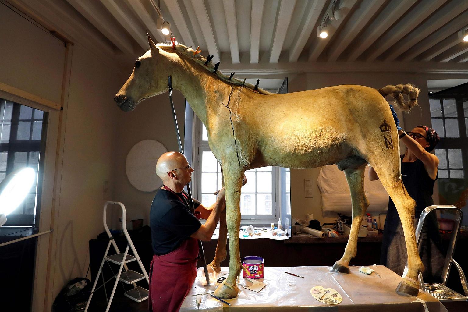 Two people restore Vizir, the last horse of Napoleon Bonaparte the Ist, at the Museum of the Army - Musee de l' Armee at the Hotel des Invalides in Paris.