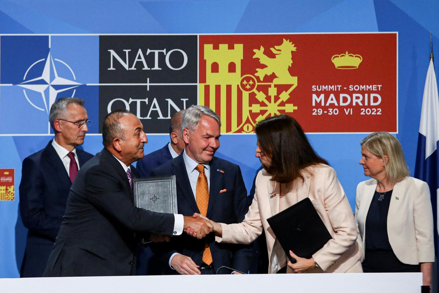 Turkish Foreign Minister Mevlut Cavusoglu shaking hands with Sweden's Foreign Minister Ann Linde during the Nato summit in Madrid on June 28, 2022.