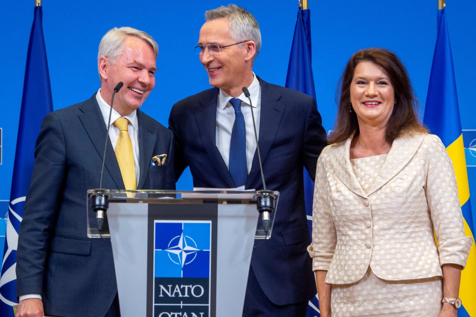 (From left) Finland's Foreign Minster Pekka Haavisto, Nato secretary-general Jens Stoltenberg and Sweden's Foreign Minister Ann Linde at the accession ceremony on July 5, 2022.