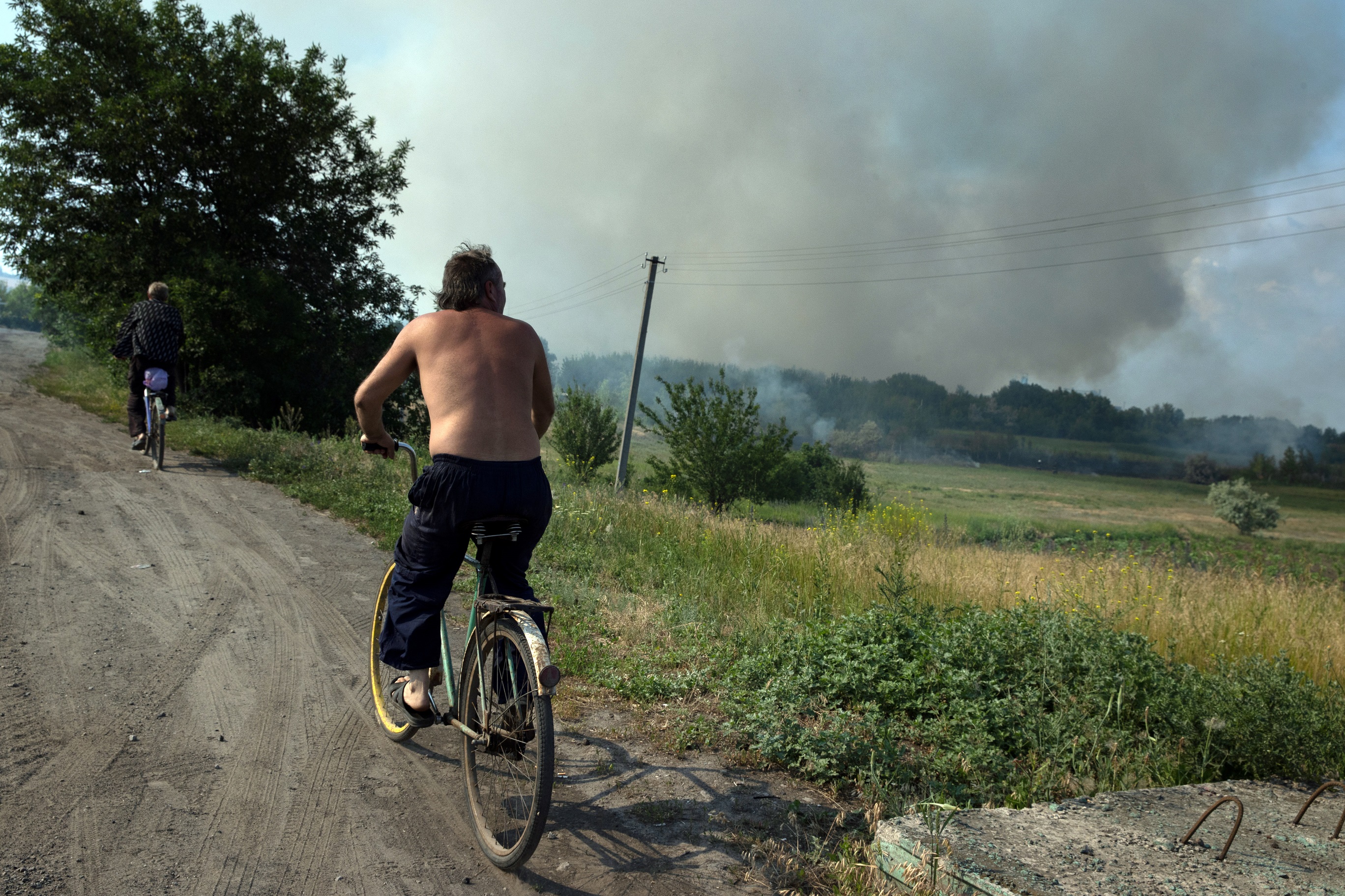 A man rides his bicycle past an agricultural field set ablaze by Russian bombs, in the Donetsk region of eastern Ukraine, on June 28, 2022.