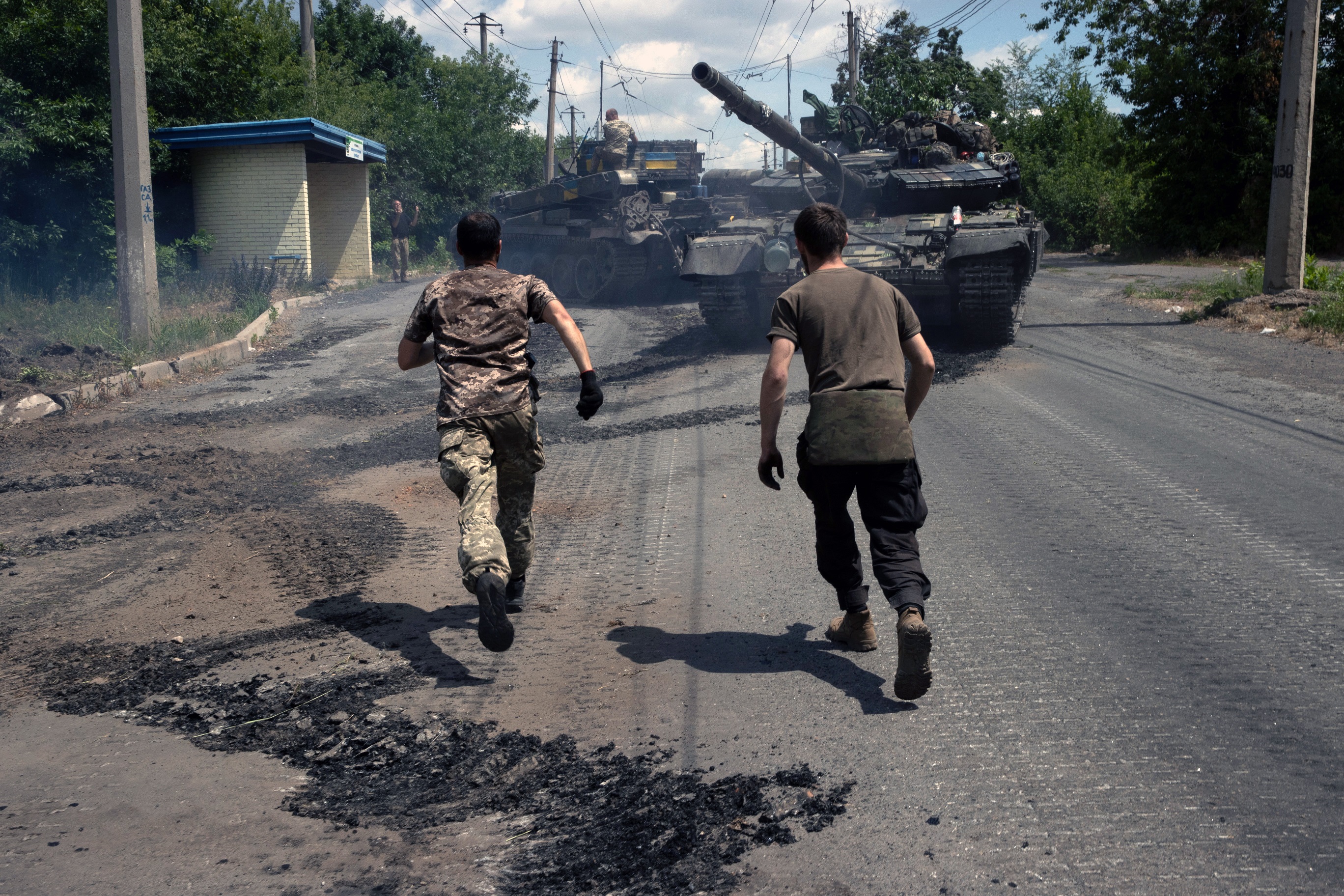 A Ukrainian T-64BV comes off the front line for repairs in Bakhmut, in eastern Ukraine, on June 29, 2022.