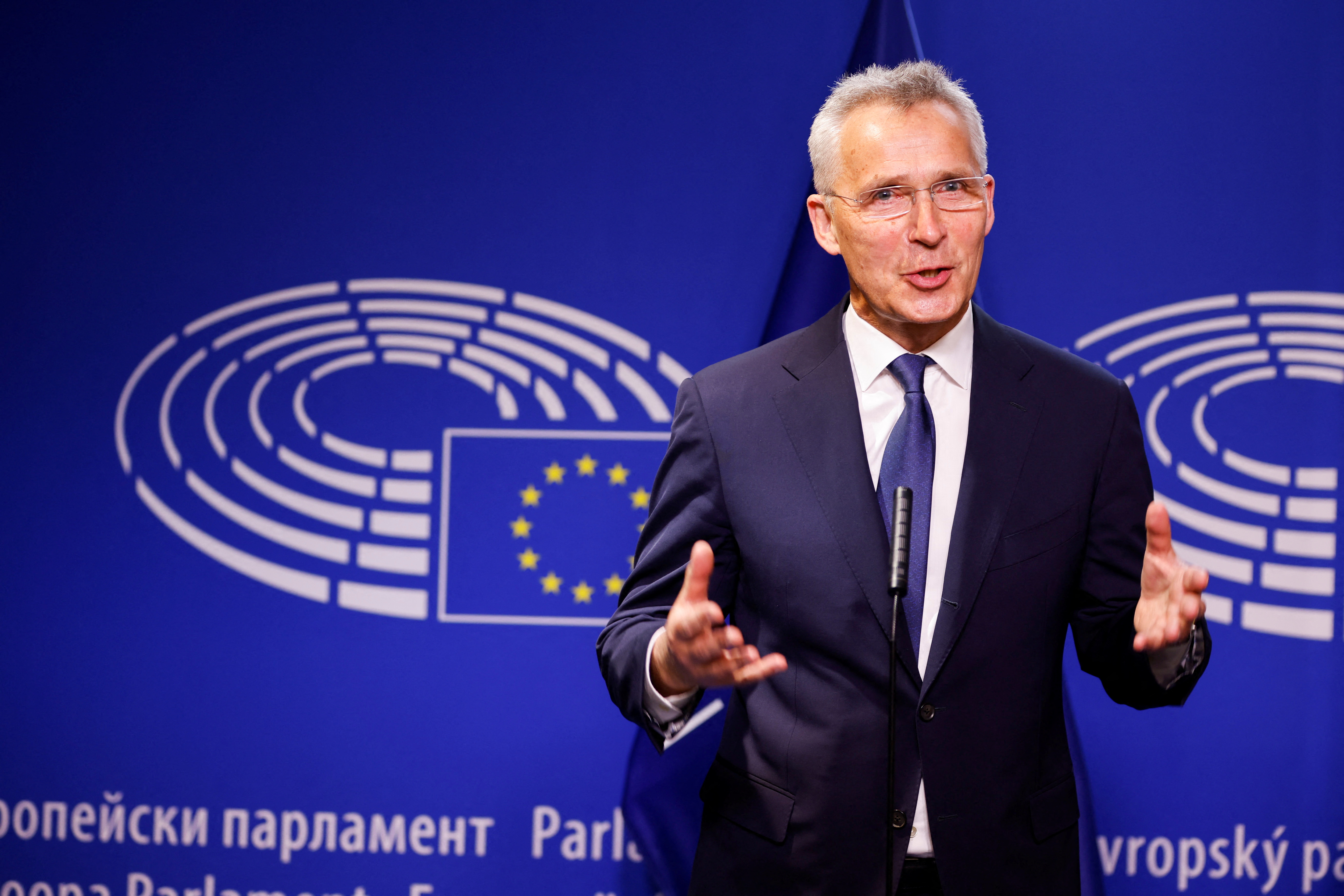 Jens Stoltenberg speaks during a news conference in Brussels, Belgium, on April 28, 2022.