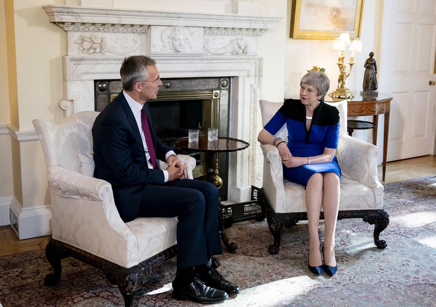 Jens Stoltenberg, secretary general of the North Atlantic Treaty Organization (NATO), left, speaks with British Prime Minister Theresa May at a bilateral meeting at No. 10 Downing Street in London on Tuesday, May 14, 2019.