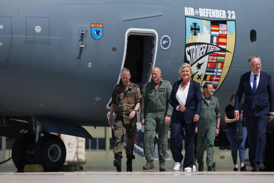 (From left) German Lieutenant-General Martin Schelleis, German Air Force Lieutenant-General Ingo Gerhartz, the Bundeswehr Parliamentary Commissioner Eva Hoegl and Lower Saxony State Premier Stephan Weil at Wunstorf Air Base on June 12, 2023.