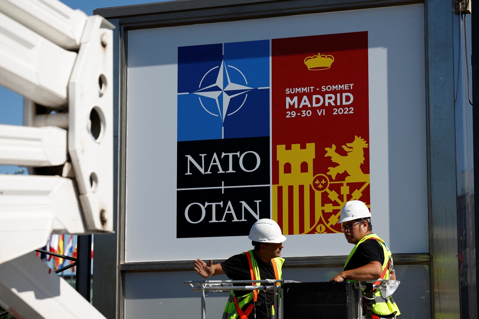 Workers paste posters outside the Madrid Fair before a Nato summit in Madrid, Spain, on June 27, 2022.