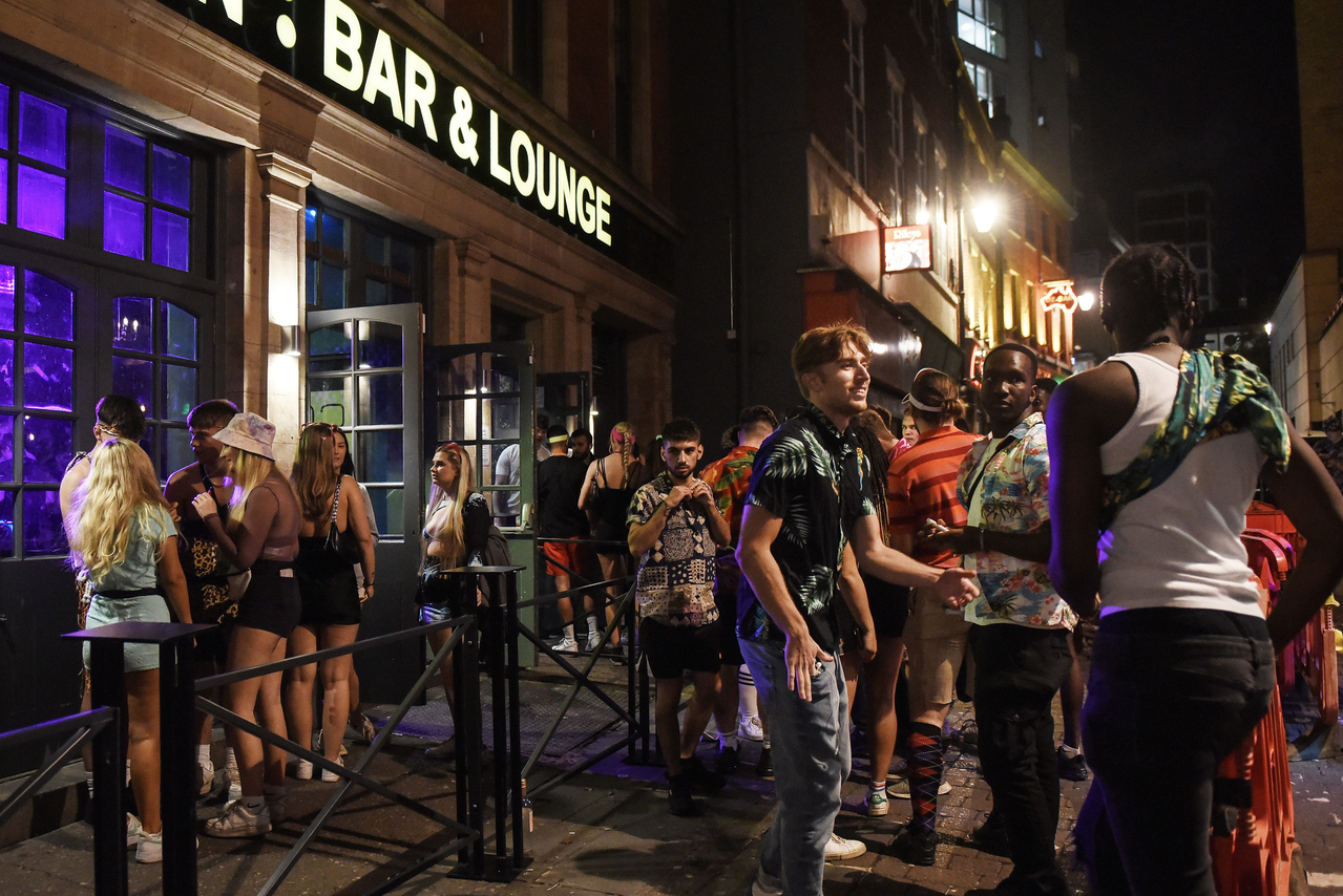 Young revellers queue outside a popular Nottingham bar and lounge on Oct 20, 2021.