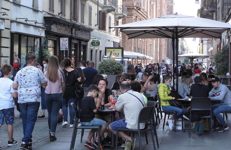 People sit at tables outside bars in Turin, Italy, on May 31, 2020.