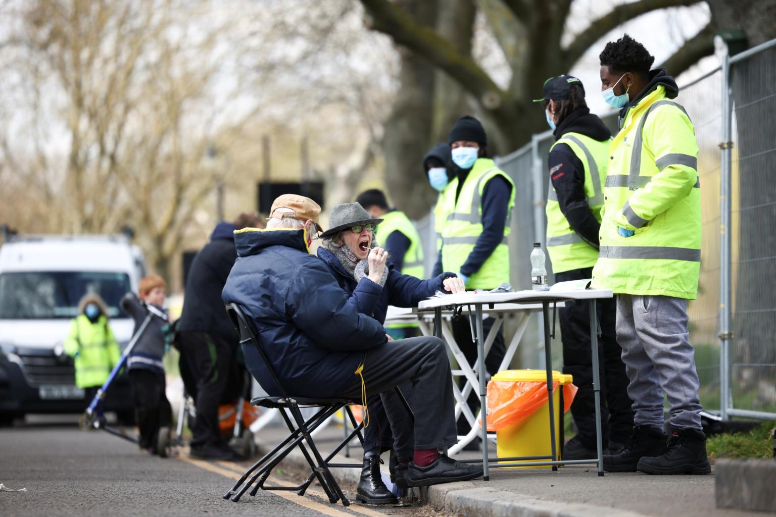 People swab themselves at a Covid-19 testing site on Clapham Common in London, Britain.