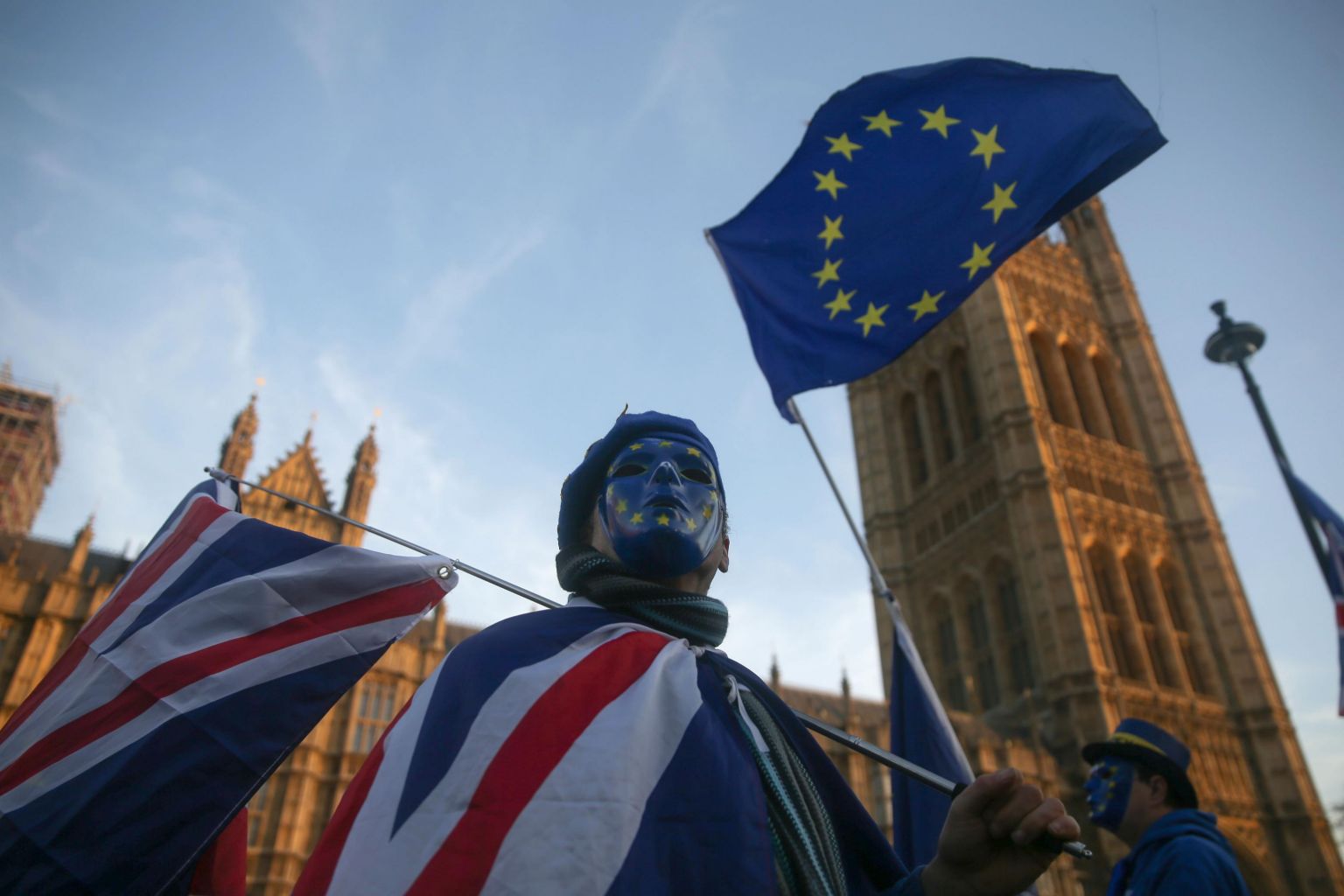 An anti-Brexit demonstrator holds a European Union flag outside the Houses of Parliament in central London on Dec 18, 2017.