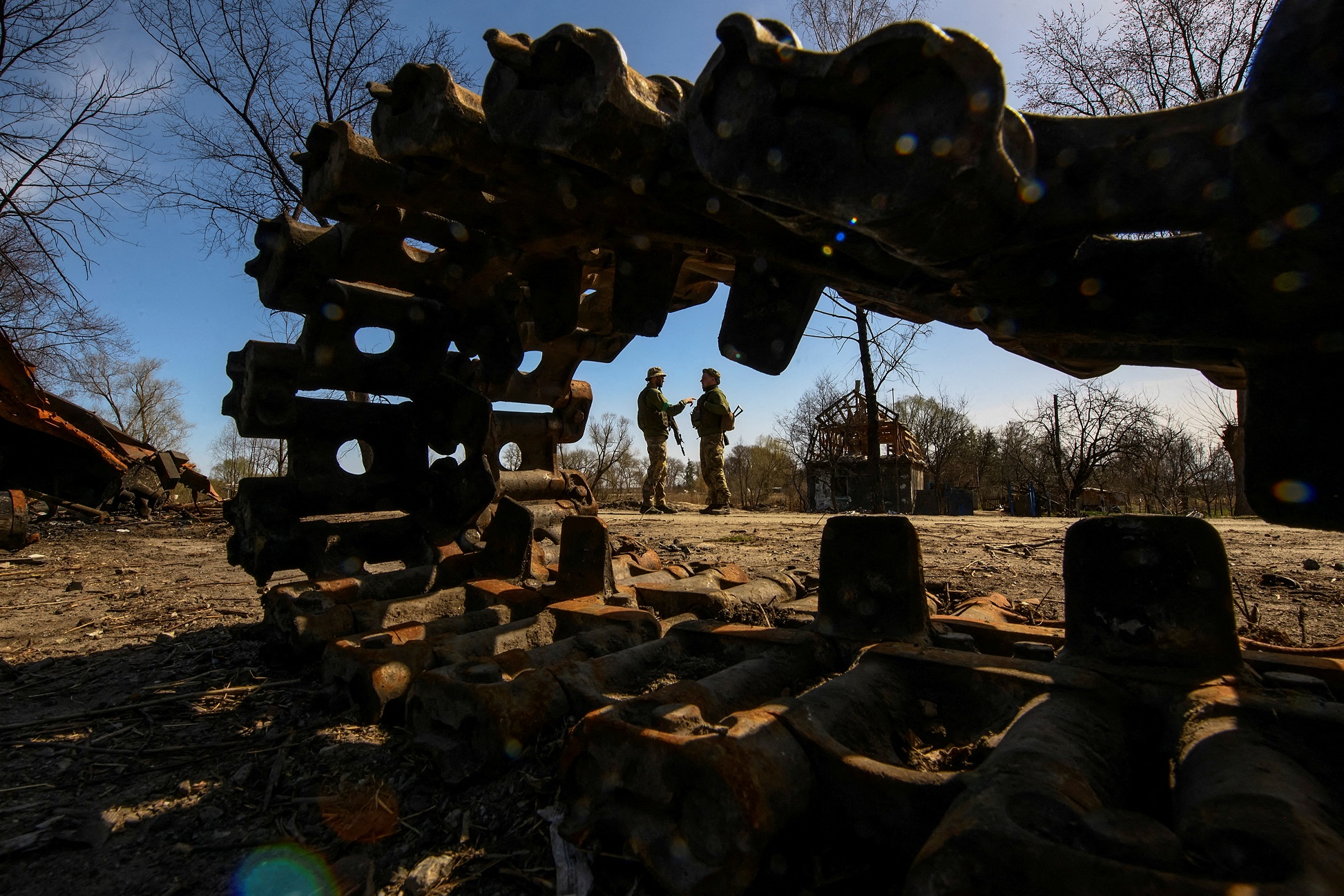 Ukrainian servicemen stand next to a tank destroyed during Russia's invasion, in the Kyiv region, on April 14, 2022.