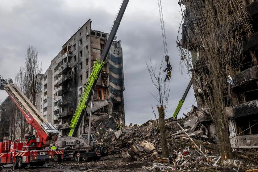 Rescue personnel use a crane to survey the ruins of a bombed apartment building in Ukraine on April 9, 2022.