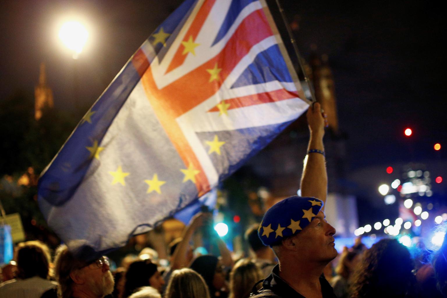 An anti-Brexit protester holds a flag outside the Houses of Parliament in London, Britain on Aug 28, 2019.