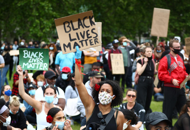 In London's Hyde Park, many of the protesters wore face masks and were dressed in red. They chanted "George Floyd" and "Black lives matter".