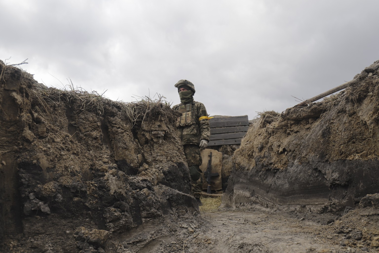 A Ukrainian serviceman keeps watch at a position near Kyiv, Ukraine, on March 8, 2022.