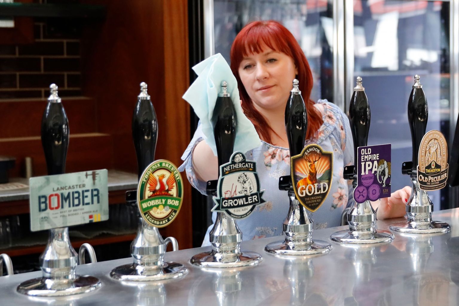 A staff member at a Wetherspoons pub in north London cleans the bar in preparation for pubs to reopen.