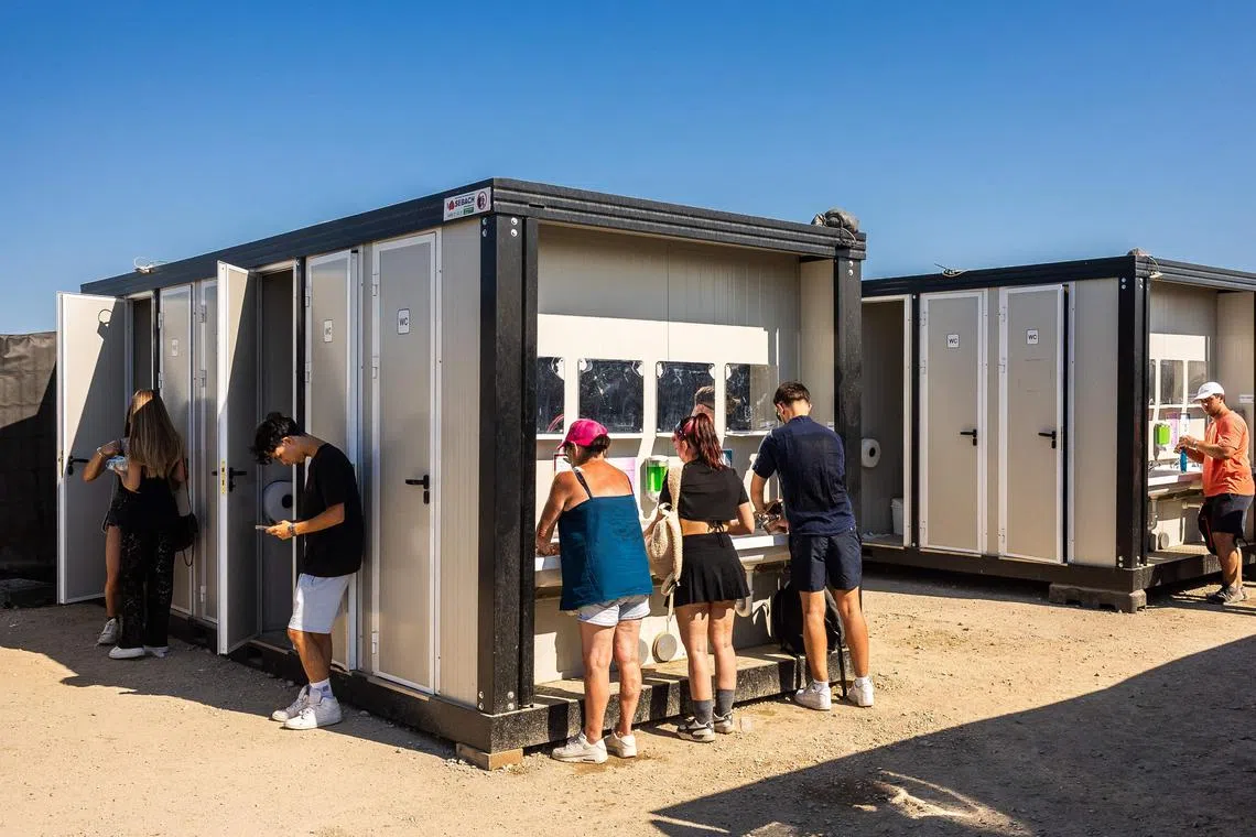 Festival-goers filling their bottles at a tap during the Les Deferlantes music festival in Le Barcares, southern France, on June 29, 2025.