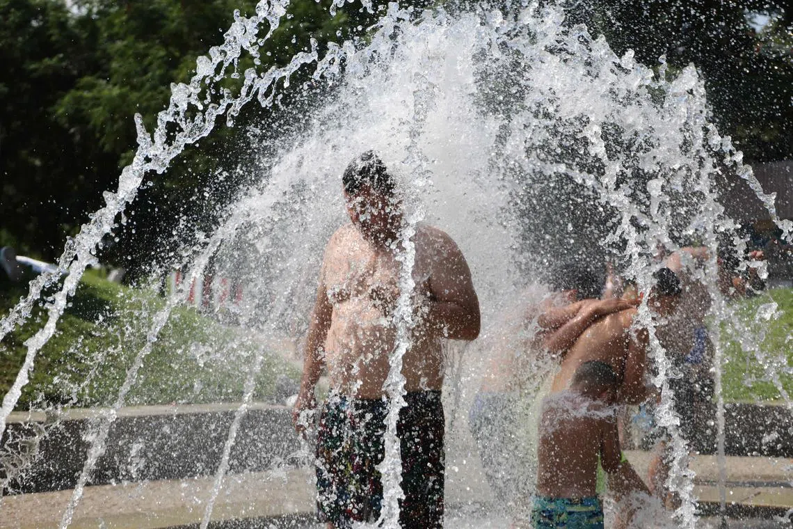 People cooling down underneath water fountains in the Madrid Rio recreation area during the first heatwave of the summer in Madrid, on June 28, 2025.