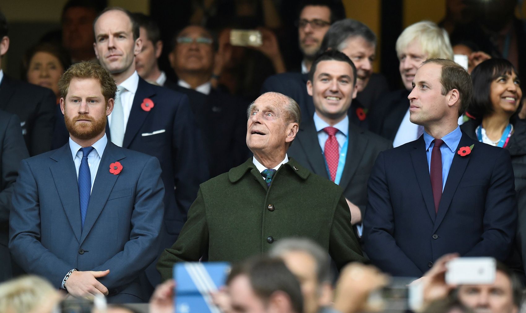 Prince Philip (centre) at the 2015 Rugby World Cup final match with Prince Harry (left) and Prince William (right).