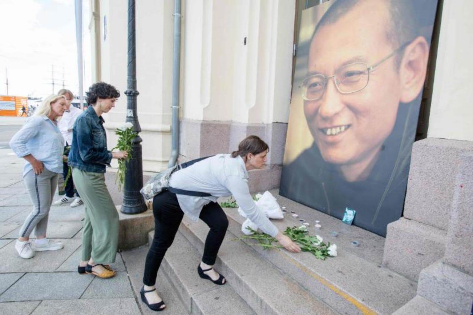 People lay flowers and light candles outside the Nobel´s Peace center in Oslo, Norway in front of a photo of Nobel peace laureate Liu Xiaobo who died on July 13, 2017.