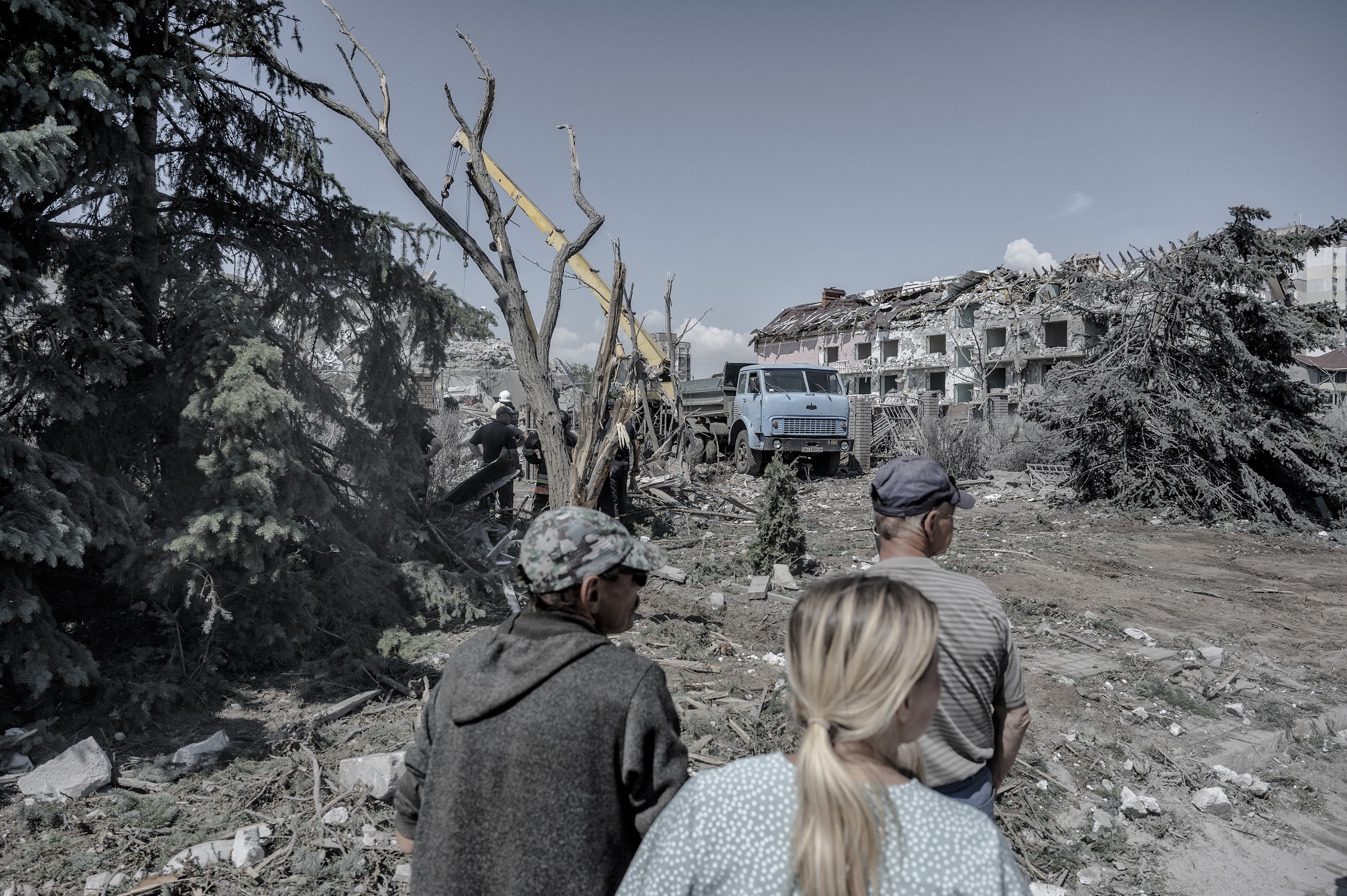 Rescue workers clear debris following a Russian missile strike in Serhiivka village, south-west of Odesa, in Ukraine, on July 1, 2022.