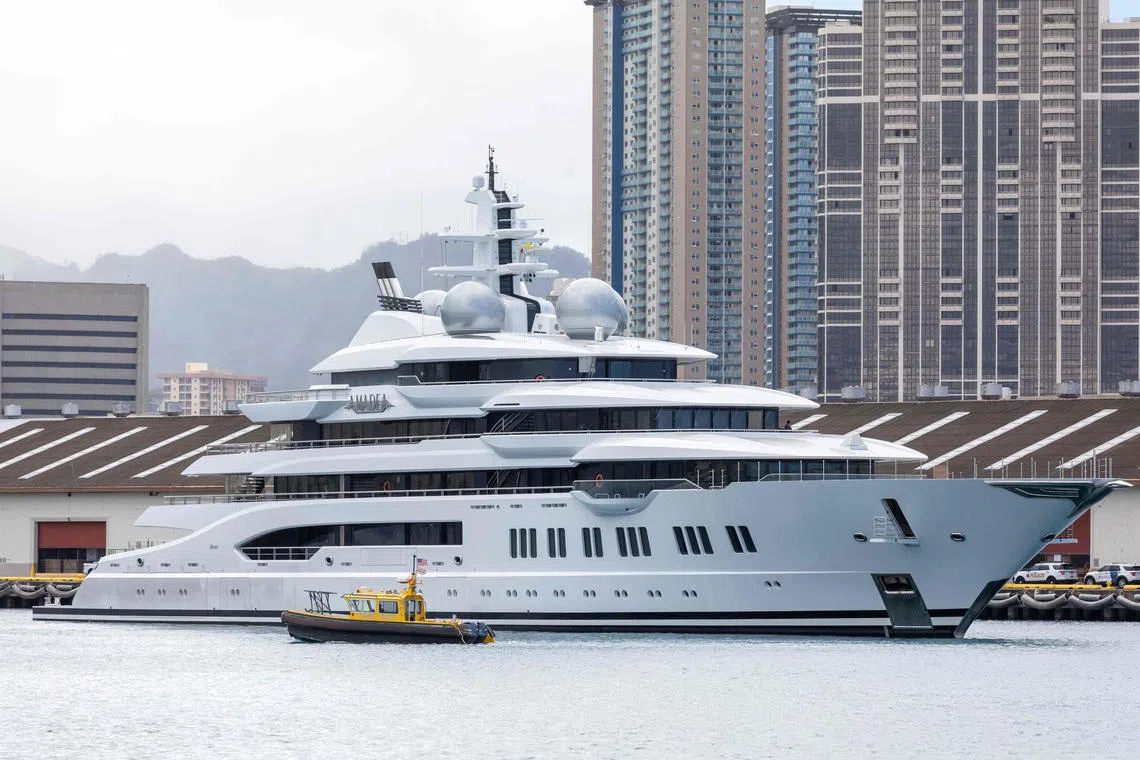 A harbour pilot boat in Hawaii in 2022, cruising past a seized yacht owned by sanctioned Russian oligarch Suleiman Kerimov.