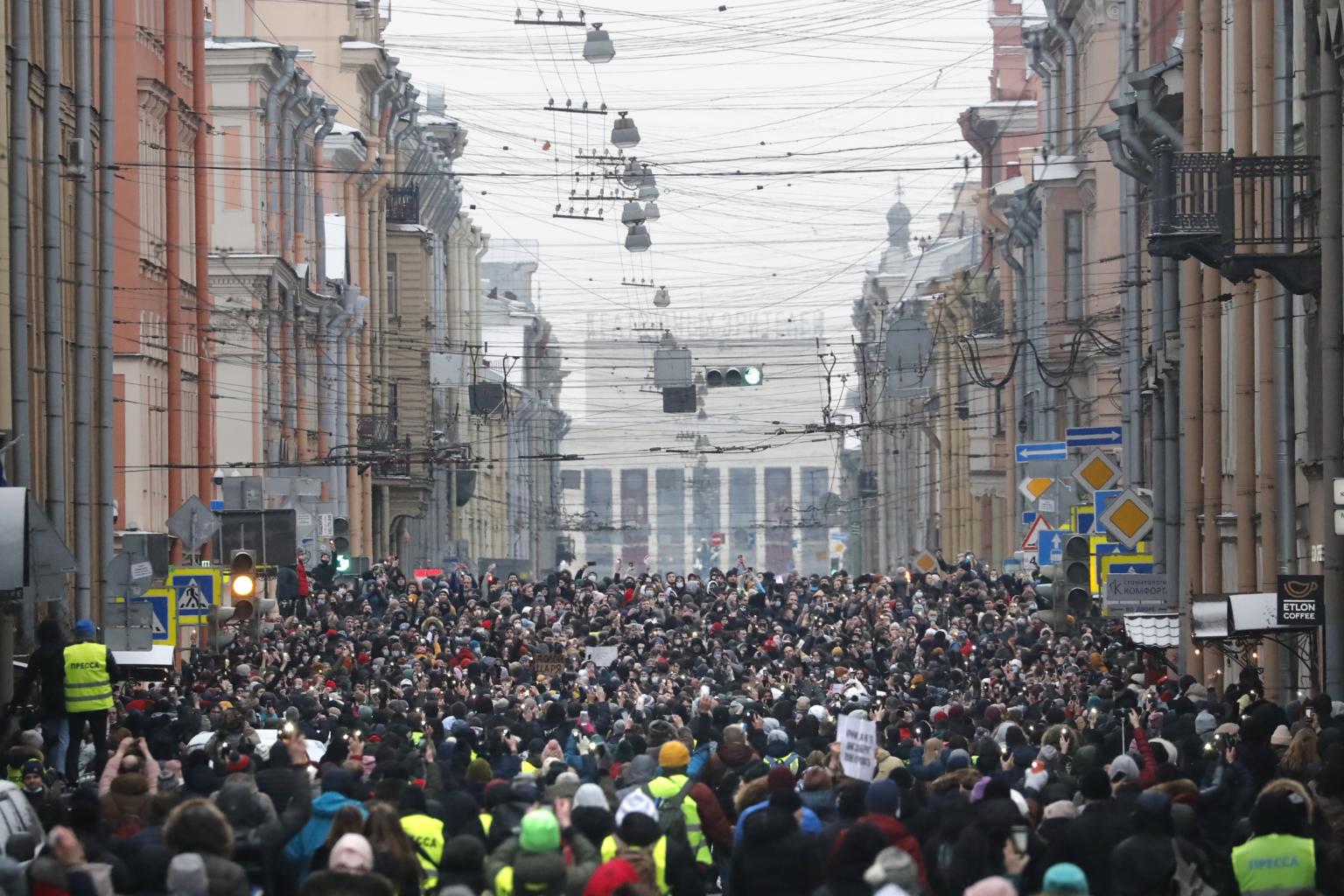 Protesters in support of Russian opposition leader Alexei Navalny, in St. Petersburg, Russia, on Jan 31, 2021.