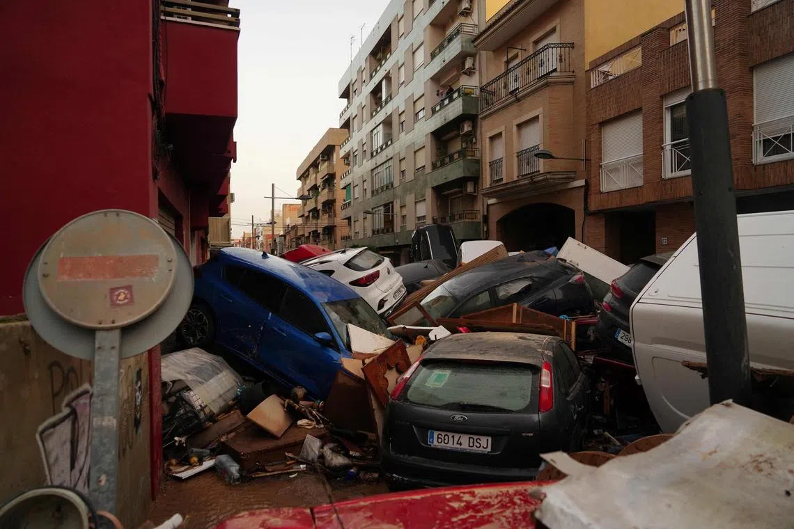 Cars piled up following deadly floods in the Alfafar neighbourhood, south of Valencia, Spain, on Oct 30.