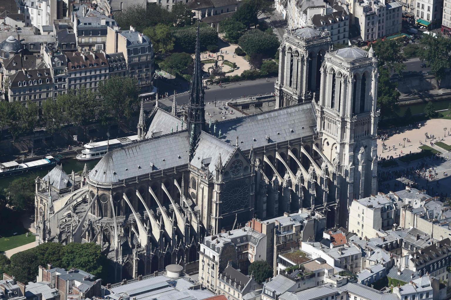 An aerial view of the Notre-Dame Cathedral in Paris, France, in July 2017. Building started in 1163 and finished in 1345.