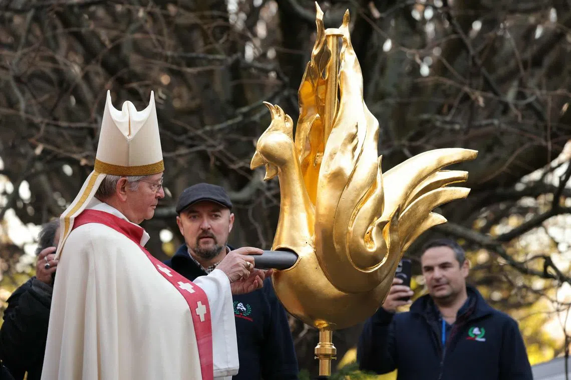 The new weather vane rooster, made of golden copper, was blessed by Paris Archbishop Laurent Ulrich during a ceremony on the morning of Dec 16. Inside the rooster are religious relics and a parchment with a long list of the names of workers, as well as donors and patrons.