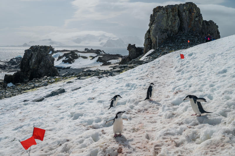 In a photo from Feb 12, 2020, chinstrap penguins trek up steep slopes too slippery even for humans, in order to reach their nests on the rocky Half Moon Island in the Antarctic region.