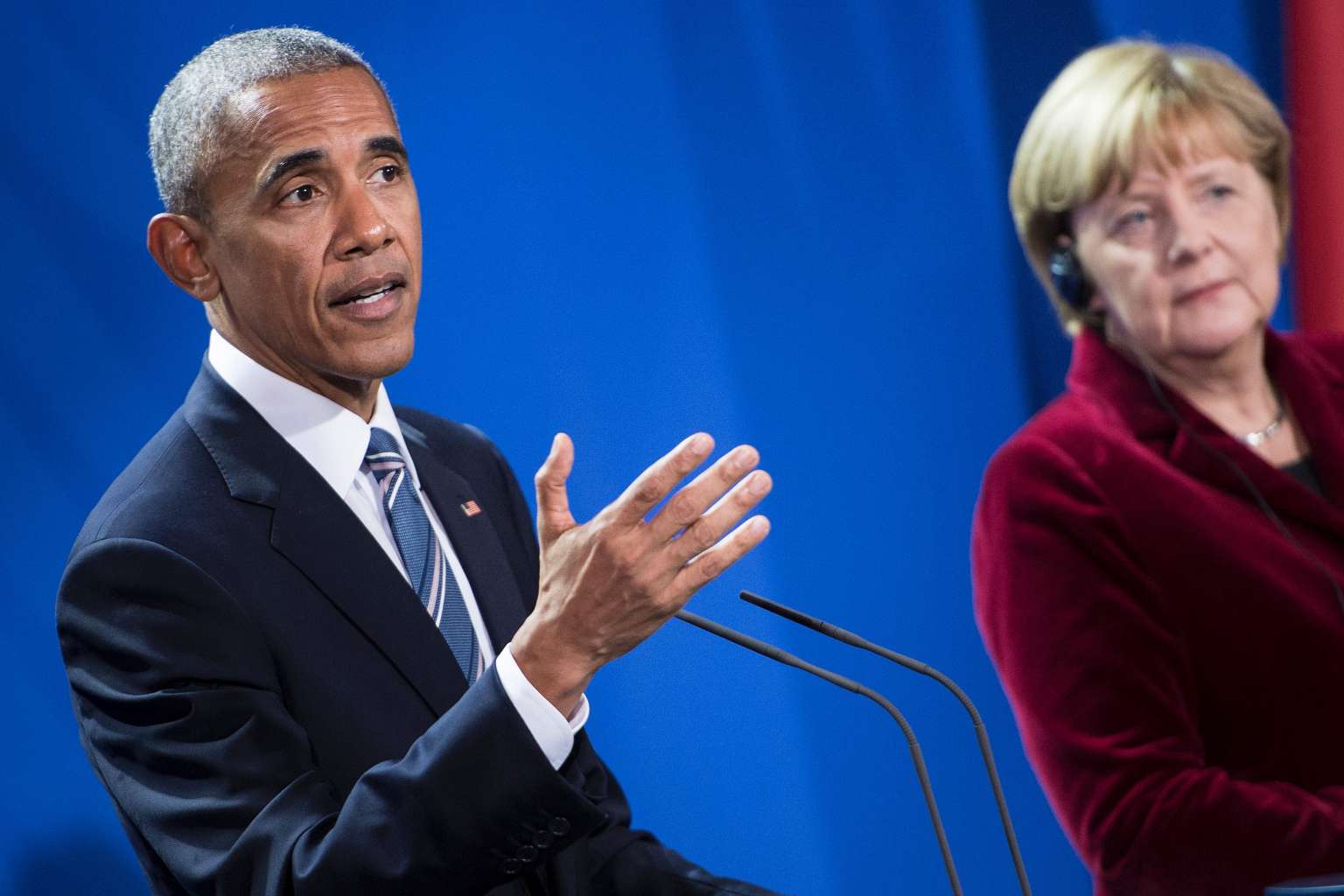 German Chancellor Angela Merkel (right) listens while US President Barack Obama speaks during a press conference after their meeting at the chancellery in Berlin on Nov 17, 2016.