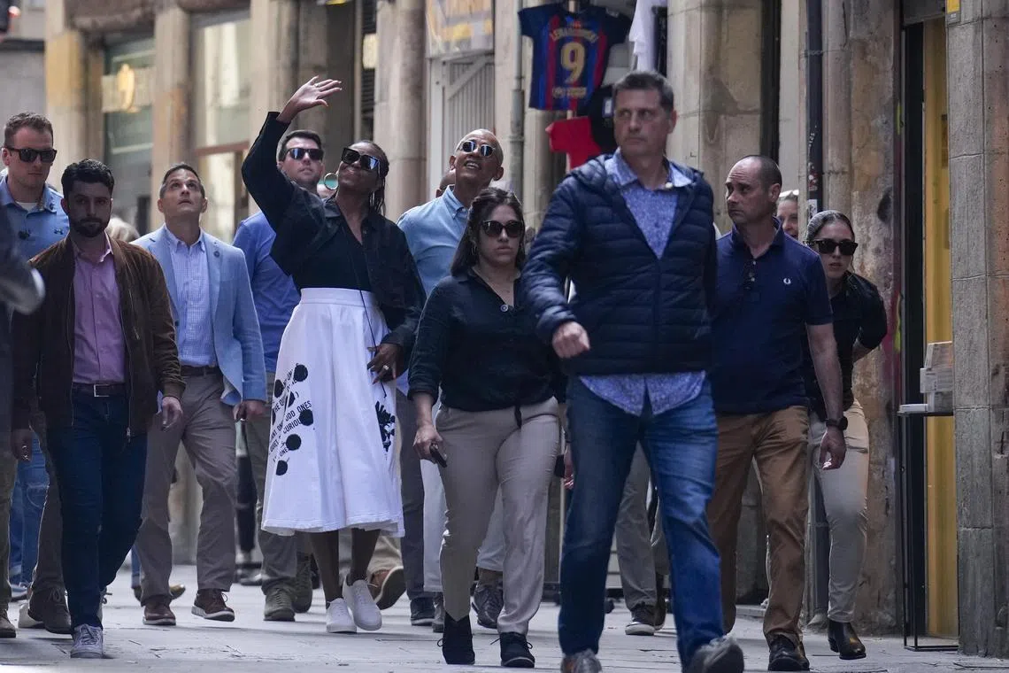 Former US president Barack Obama and his wife Michelle taking in the sights of Barcelona on April 28, surrounded by a large group of security guards.