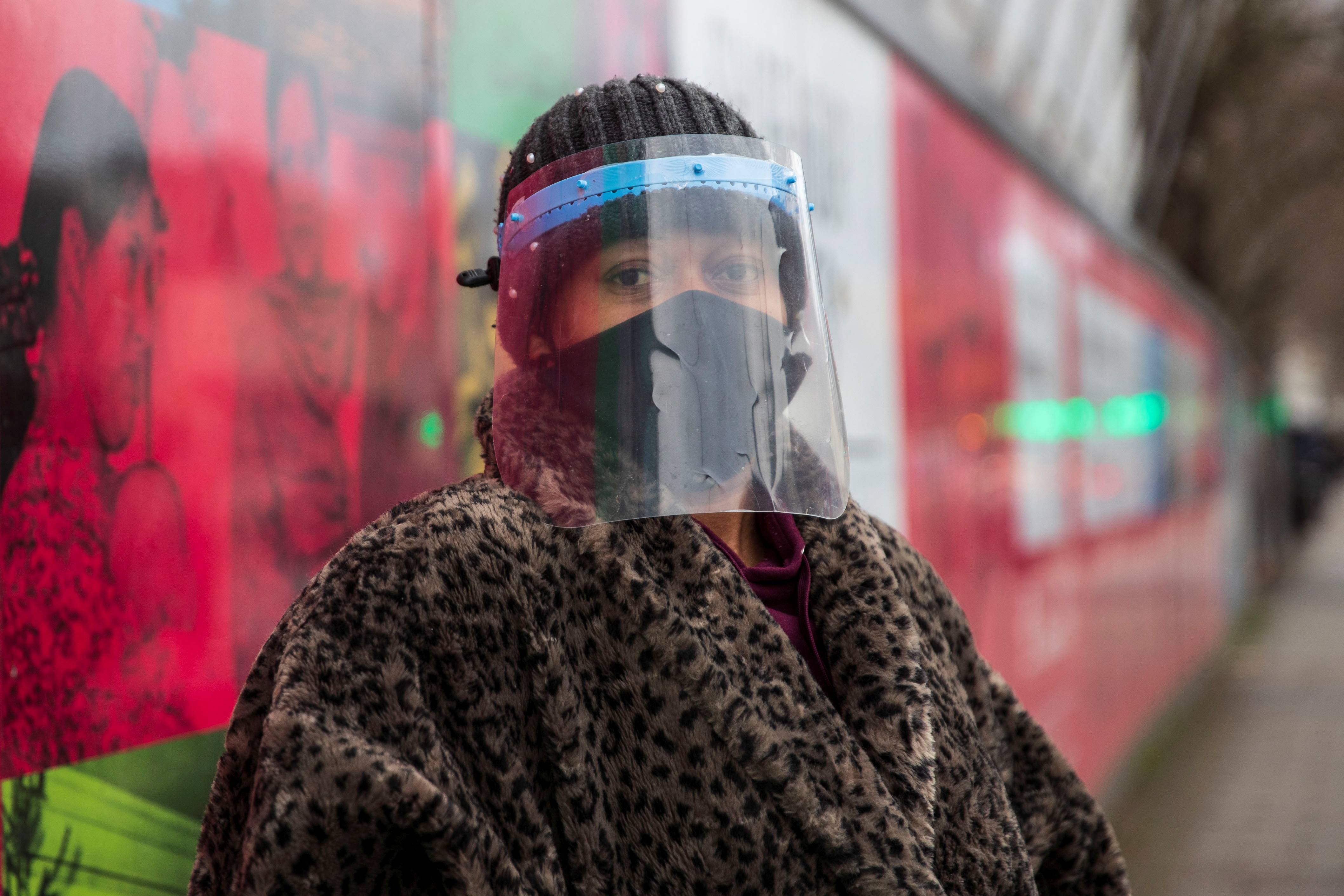A woman wearing a protective face shield stands outside the Royal London Hospital, on Dec 31, 2021.