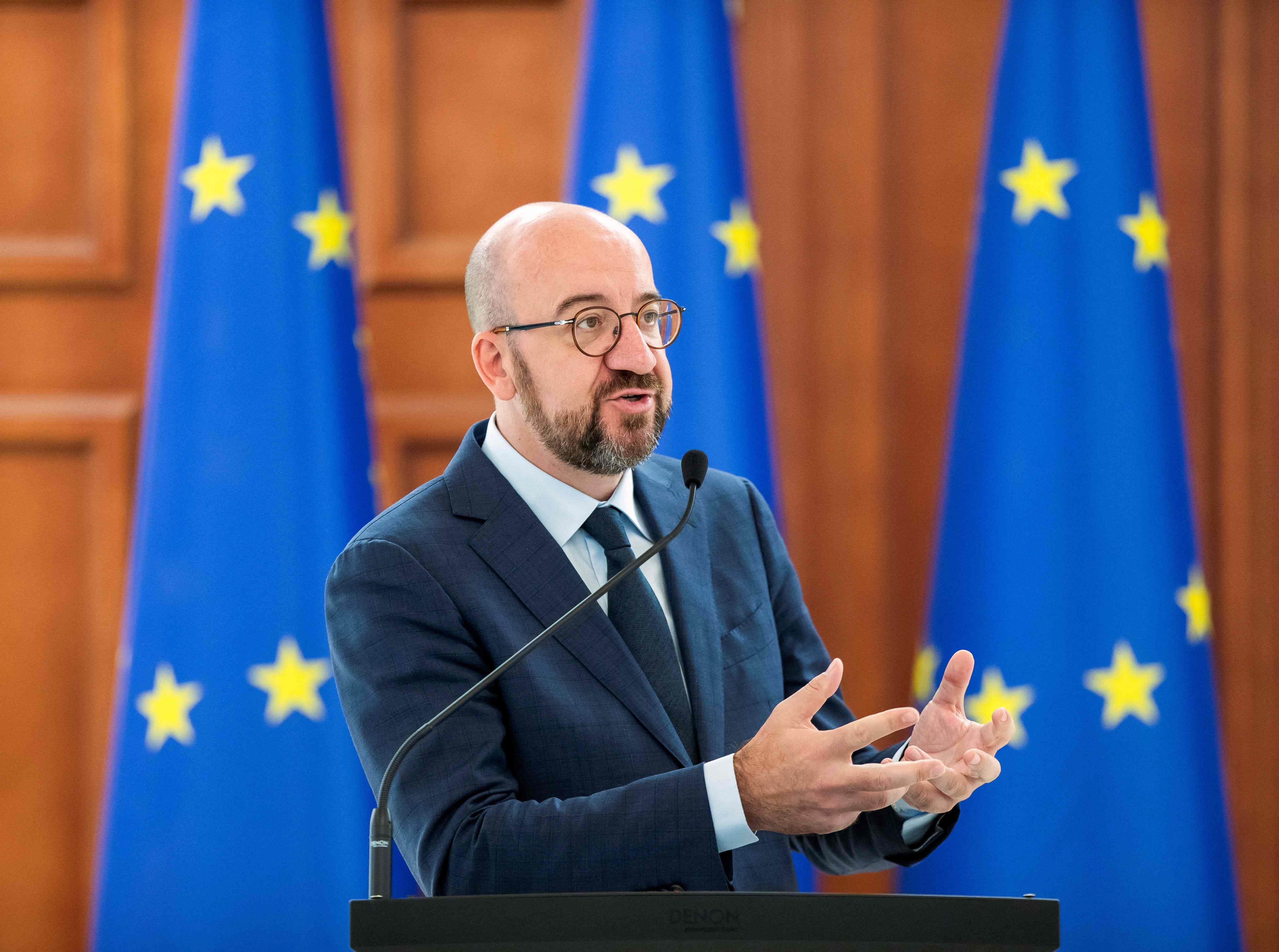 European Council President Charles Michel (pictured) was meeting Ukrainian PM Denys Shmygal when missiles struck Odesa.