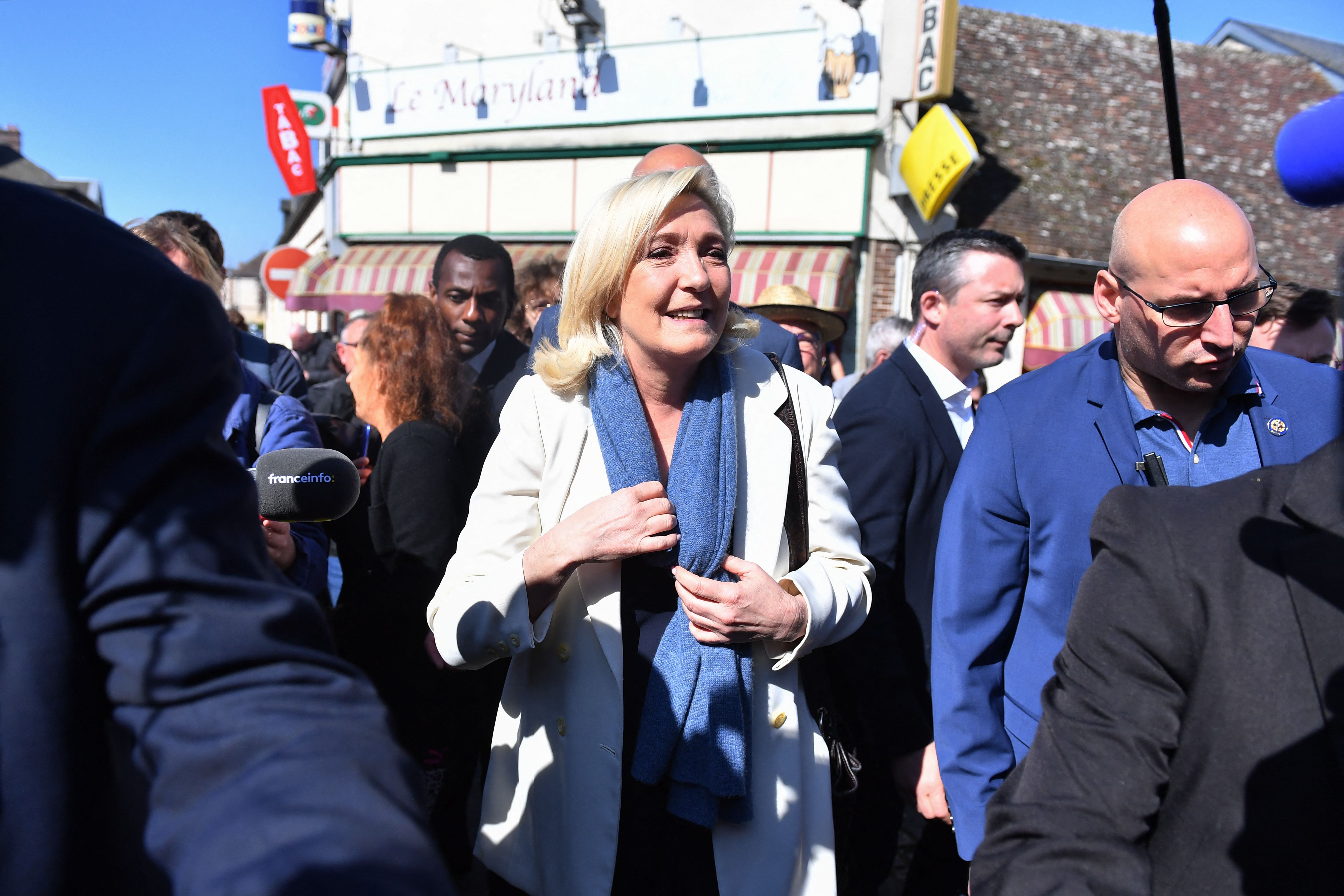 Far-right presidential candidate Marine Le Pen (centre) on the campaign trail in France, on April 16, 2022.