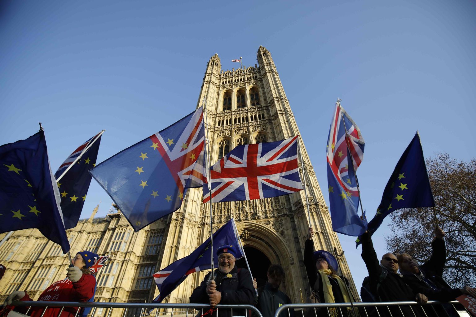 Anti-Brexit activists fly flags showing the colours of the Union Flag and the EU flag outside the Houses of Parliament in London on Dec 11, 2018.