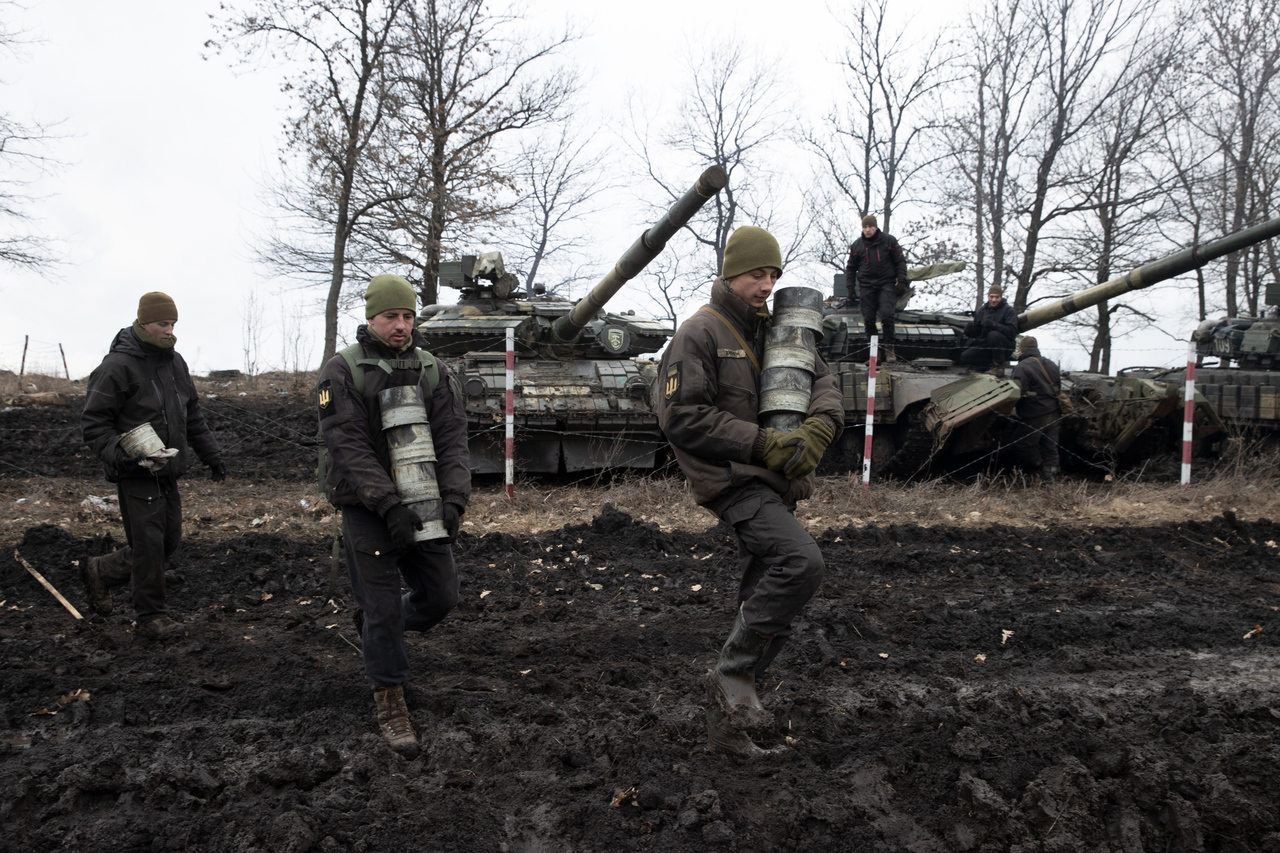 Ukrainian soldiers moved weapons amid the looming threat of invasion by Russia, in Tarasivka, Ukraine, on Feb 17, 2022.